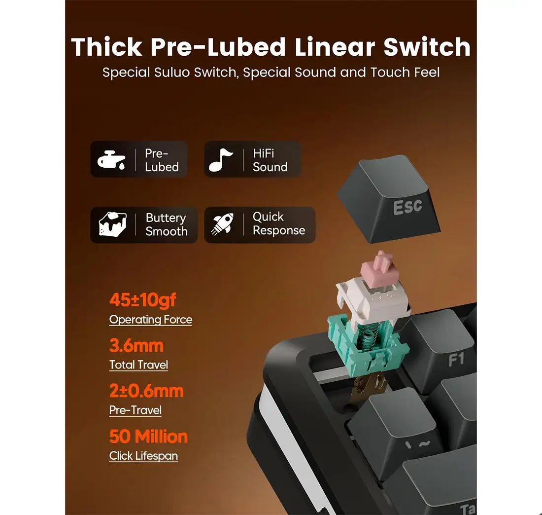 - کلیدها از نوع Leopard Linear یا مشابه با حس ضربهای نرم و پاسخدهی سریع